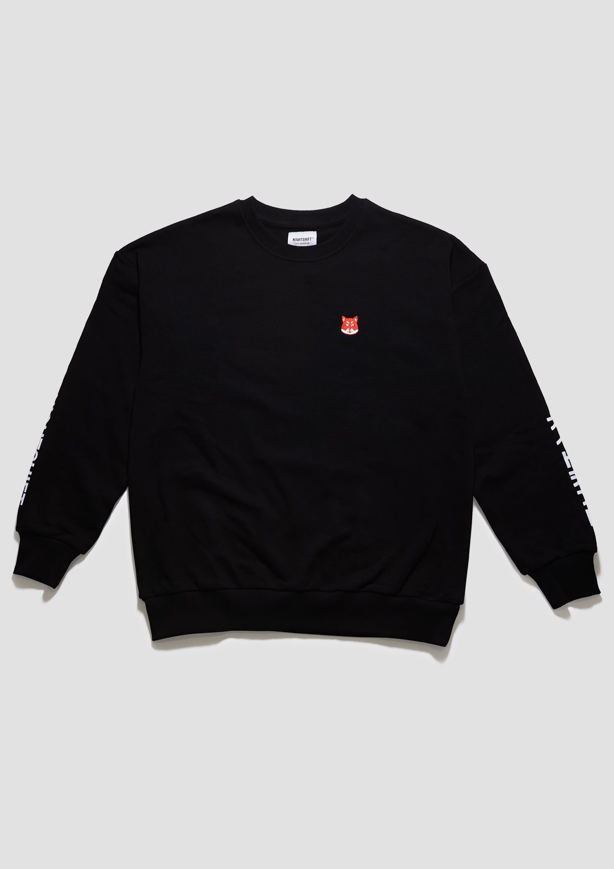 Drop shoulder sweater with printed & embroidered designs on the front, back, and sleeves. Small embroidery of "休憩してきな" (Take a break.) on the back.